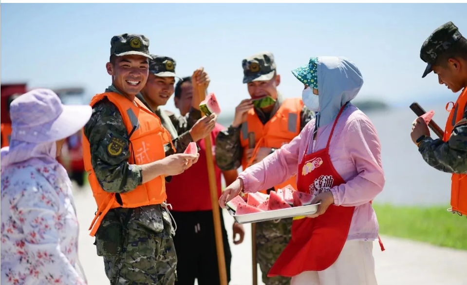 怀揣感激与热爱,群众自发涌上街头,慰问执行防汛任务的官兵。军爱民,民拥军,军民鱼水情深。